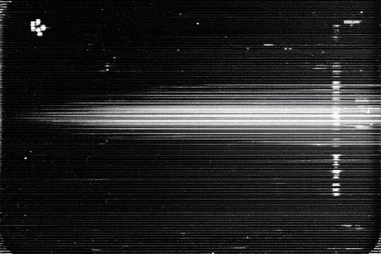 Grayscale, horizontal lines create a light streak. Distorted, noisy effect with black borders
