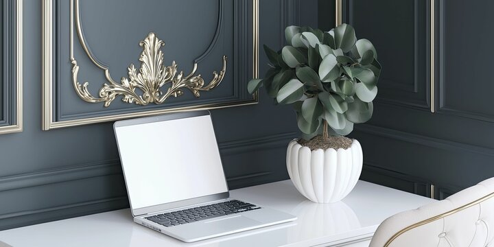 An inviting home workspace with a laptop, e-commerce product mockups, and a small plant, radiating productivity and creativity.
