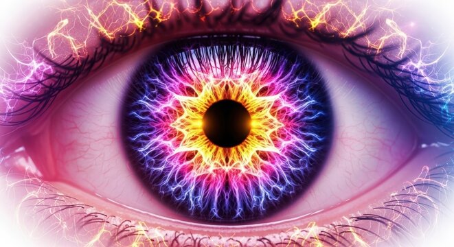Woman eye with colorful electric energy radiating from iris. Concept of vision, brain activity, and spiritual awakening.