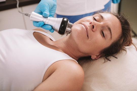 Charming mature woman relaxing at beauty salon, getting rf-lifting facial treatment. Cosmetologist using rf-lifting machine, tightening face skin of a female client