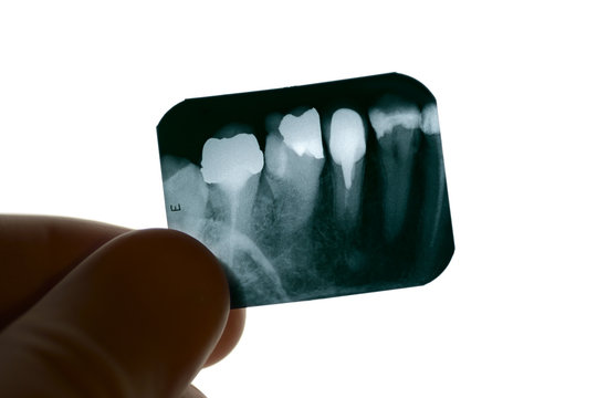 Dentists reviewing dental x-ray on tablet while examining patient in clinic