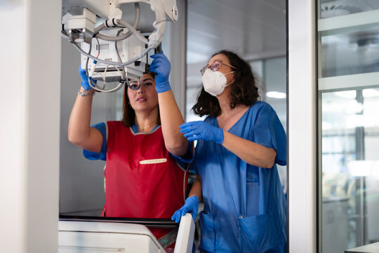 Two female radiographers preparing x-ray machine in hospital radiology department