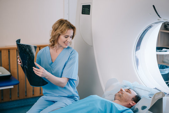 beautiful smiling doctor holding radiology diagnosis and looking at man lying on ct scanner bed