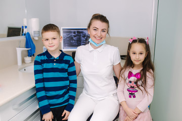 Young patients girl and boy look at the monitor x-ray snapshot