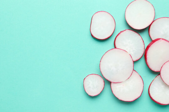 Web banner with watermelon radish slices on white with copy space. Colorful vegetable. Top view