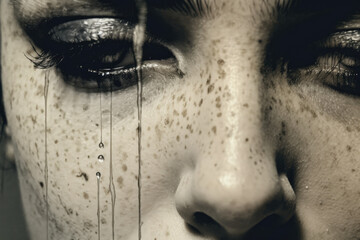 Tears on eyes. Open expressive look eyes with teardrop on the eyelashes macro close-up black and white. Sensual expressive sad artistic image