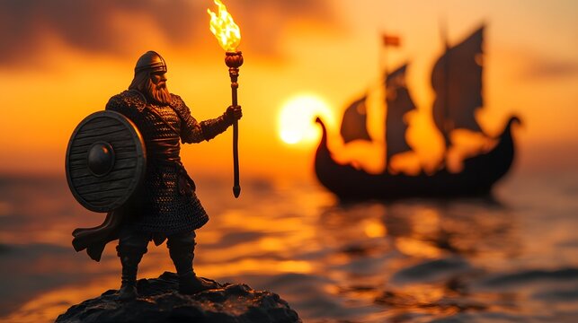 16. Viking raider figure holding a torch and shield as a ship sails behind