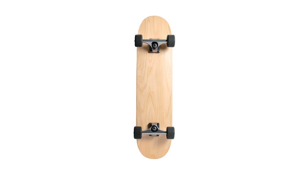 Overhead shot of a new, bare wooden skateboard against a black background. The deck is light brown with black trucks and wheels