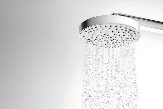 Shower head spraying water. Minimalist aesthetic and bright, white background