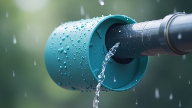 Water Catcher. Blue rain gauge with water dripping in rainy weather, m
