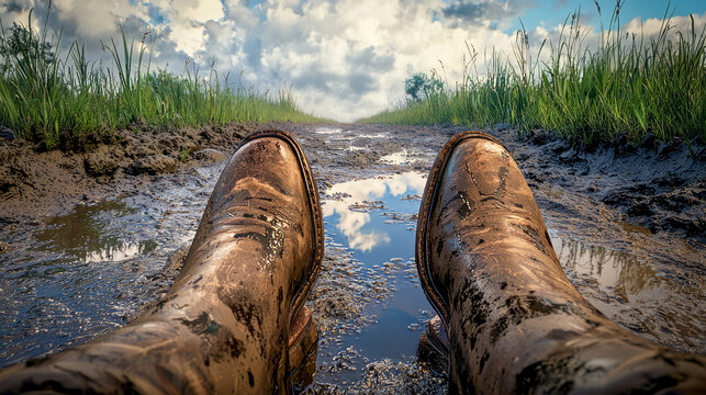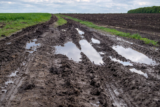 Mud and puddles on a dirt road after rain