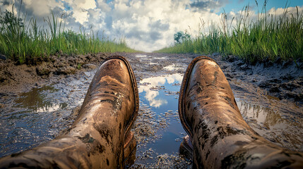 Scenic Muddy Road Reflecting Cloudy Sky in Rural Landscape