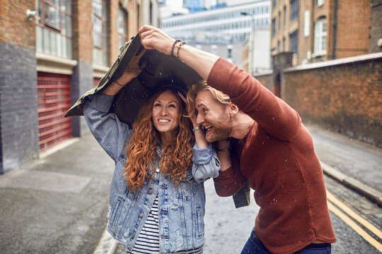 side view of sexy shirtless man and brunette woman hugging and kissing on dark background under falling rain