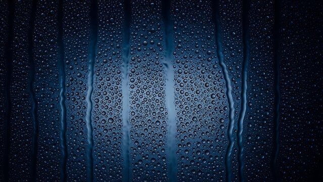 Close-up of water droplets and rain streaks on a dark blue glass surface.