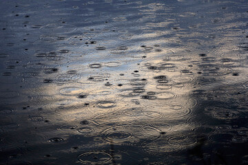 blue color tone of close up rain water drop falling to the floor in rainy season