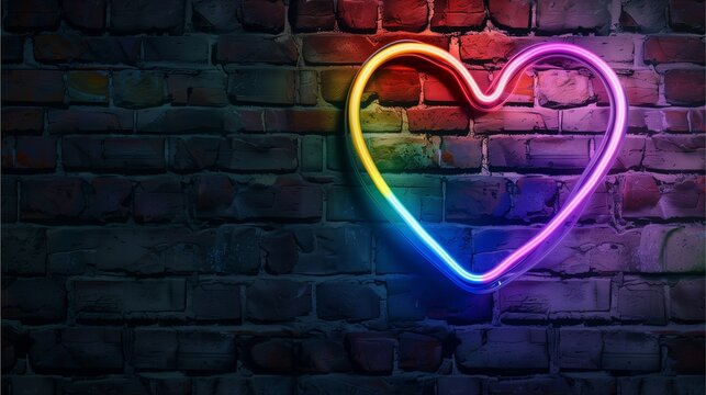 rainbow neon sign heart on dark brick wall. Studio lighting. In the style of cinematic photography, photorealistic