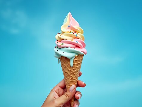 Vibrant pastel rainbow ice cream cone melting in warm sunlight, held against a blue sky with soft white clouds, capturing the essence of summer, sweetness, and colorful joy