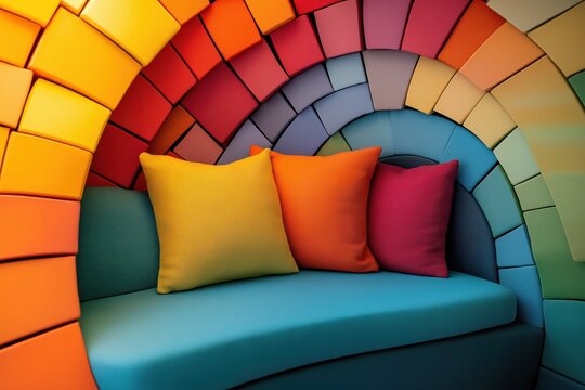 Colorful modern lounge seating with cushions in rainbow arch design, interior view