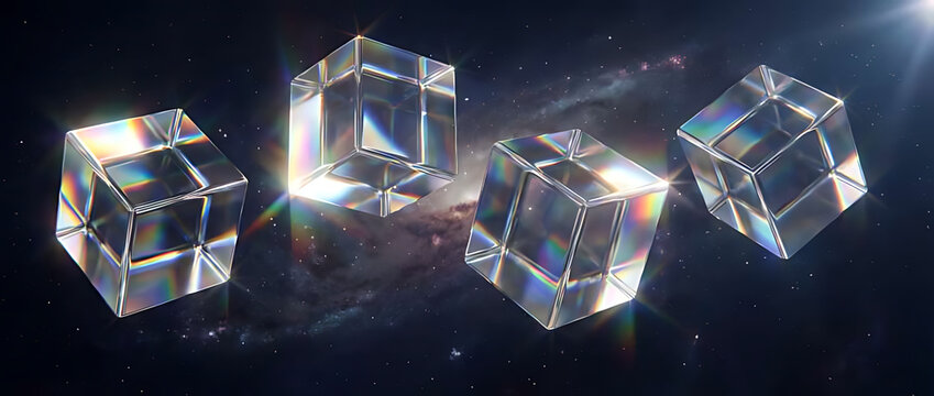 Four clear crystal cubes refracting light with rainbow spectrums against a dark cosmic background with a galaxy.