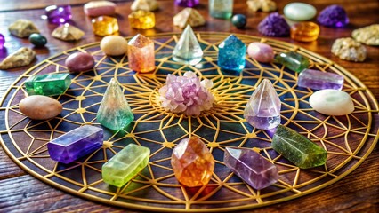 Vibrant crystal healing grid in geometric pattern on wooden surface for spiritual energy
