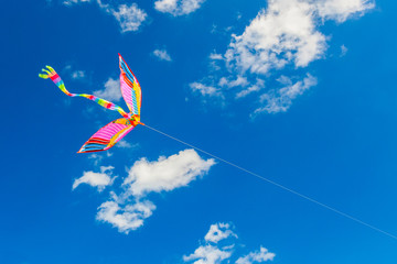 Colorful bright rainbow kite hovering in the blue sky with white clouds