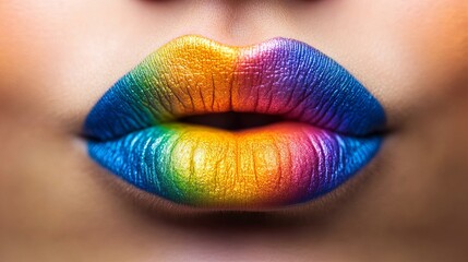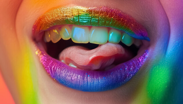 Rainbow Lips: A bold and vibrant close-up shot of full lips painted in a rainbow of colors, symbolizing individuality, diversity, and self-expression.