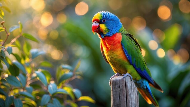 Vibrant rainbow lorikeet perched in lush greenery