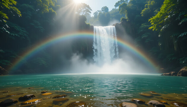 fountain in the nightA powerful waterfall cascades into a crystal-clear pool surrounded by thick rainforest. Mist rises as sunlight creates a dazzling rainbow, symbolizing the beauty and power of natu
