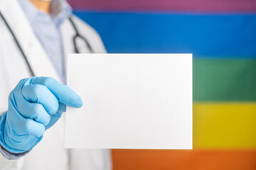 Doctor hand holding a white paper while standing with the rainbow (LGBT) flag background. Space for text. Medical and information concept