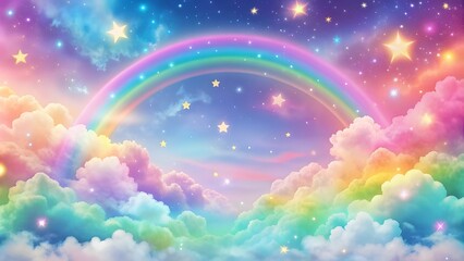 Holographic fantasy rainbow background with clouds and stars. Pastel color sky.Cloudy sky background. Unicorn fantasy pastel galaxy. Rainbow cute wallpaper. Fluffy magic pink landscape