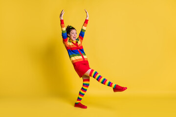 Full body photo of funky lady raise hands leg up dance wear striped sweater short skirt knee socks shoes isolated yellow color background