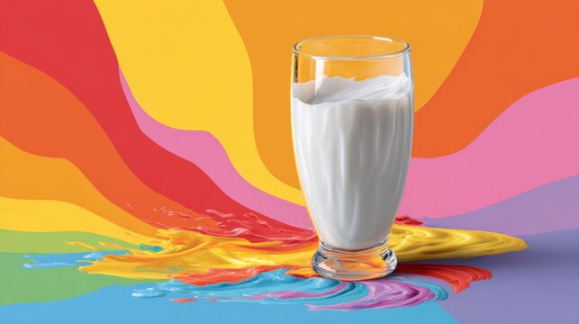 A glass of milk is on a colorful background. The background is a rainbow, which gives the image a cheerful and vibrant mood