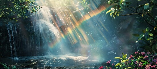 Lush fantasy landscape with rainbow and waterfalls in ethereal forest