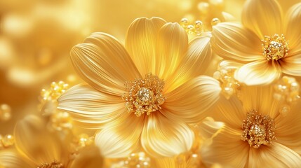 3D yellow flower background featuring golden blooms with water droplets, floral photography, nature backgrounds