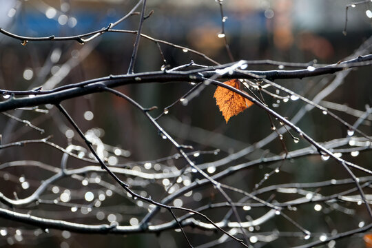 Close up view of bare tree branches with raindrops and alone last leaf on the branch in the fall season on rainy day