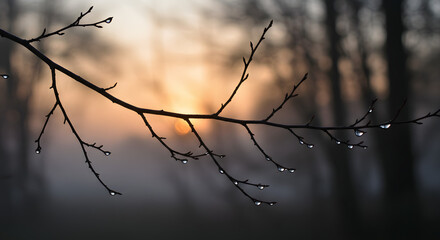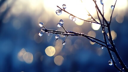 Close up of delicate water droplets on bare branches during early morning light creating a beautiful bokeh effect : Generative AI
