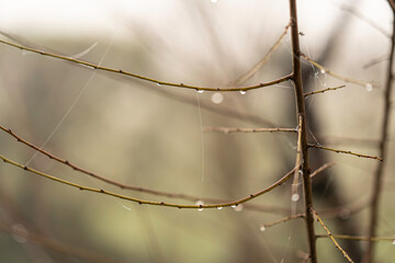 Branches with delicate spiderweb and water drops clinging