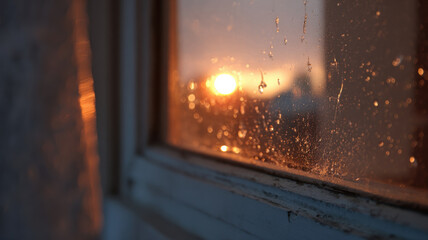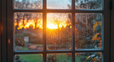 A sunset view through a rainy window, with the sun's warm glow reflecting on the raindrops and window frame