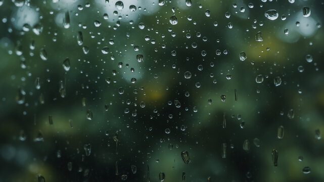 Close-up of raindrops on a window pane with a blurred green forest background water