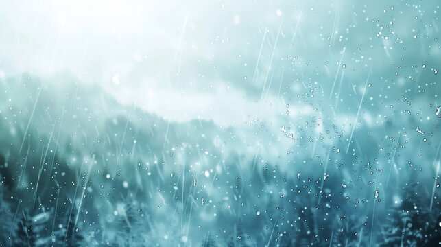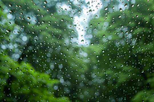 Wet window with raindrops overlooking a lush green forest. This peaceful background emphasizes nature's tranquility, perfect for adding serene ambiance.