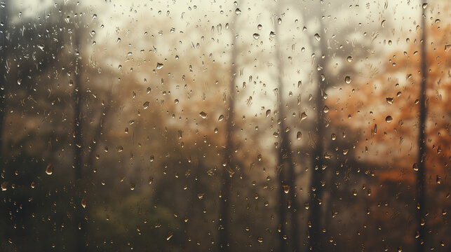 Dewy raindrops on glass with blurred forest background during a rainy day in autumn season