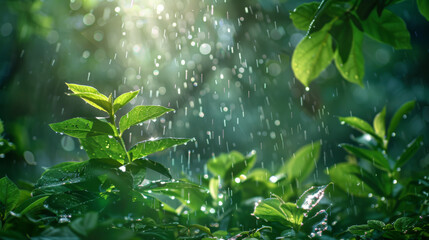 Sunlight filters through rainfall onto vibrant green leaves, creating a fresh and serene natural scene in the forest.