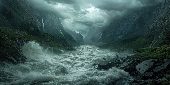 A river flowing through mountains following a stormy rainfall leading to inundation and flooding in the midst of torrential rain depicting a natural calamity and disaster