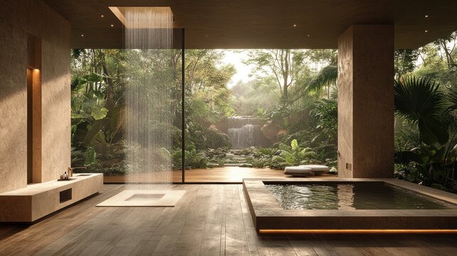 Luxurious bathroom with rainforest view, indoor pool, and rainfall shower.