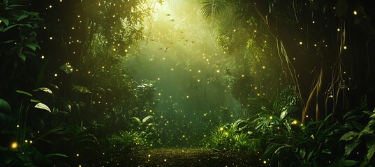 Dense jungle trees shimmer as fireflies illuminate the night with an eerie, magical glow