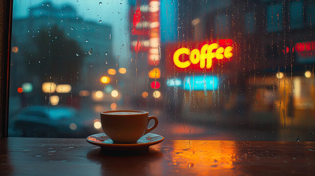 Hot coffee cup on rainy cafe window table with glowing city lights and blurred street view, cozy ambiance capturing solitude, warmth, and urban lifestyle vibes
