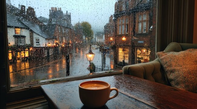 Rainy day view from a cafe window; a cup of coffee sits on a dark wooden table in front of a rain-streaked window overlooking a charming, rain-lit street scene of old buildings