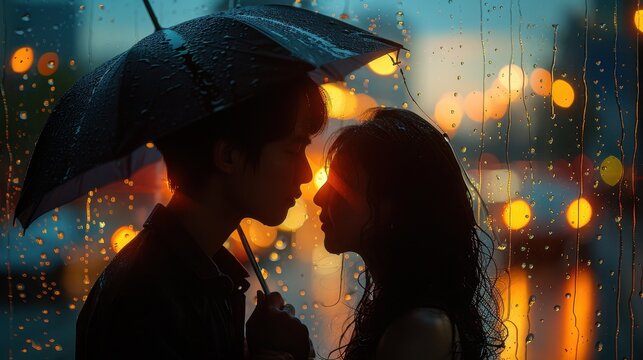 Romantic couple embracing under red umbrella on rainy city street at twilight with bokeh lights