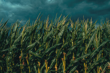 Dark stormy clouds over tasseling corn crop plantation field in summer