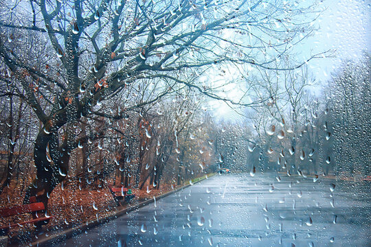 glass window with rainy droplets green trees on background. water drops on dripped wet background pane in a rainy days.  natural green forest wallpaper. shover weather. rainy season.